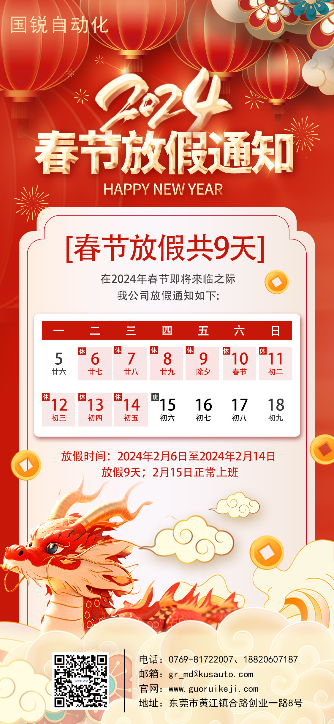 分享玉兔歡騰辭舊歲,龍騰盛世啟新航!春節(jié)即將來臨,國銳自動化全體同仁向您致以最誠摯的新年祝福:愿您在龍年工作順心、身體健康。